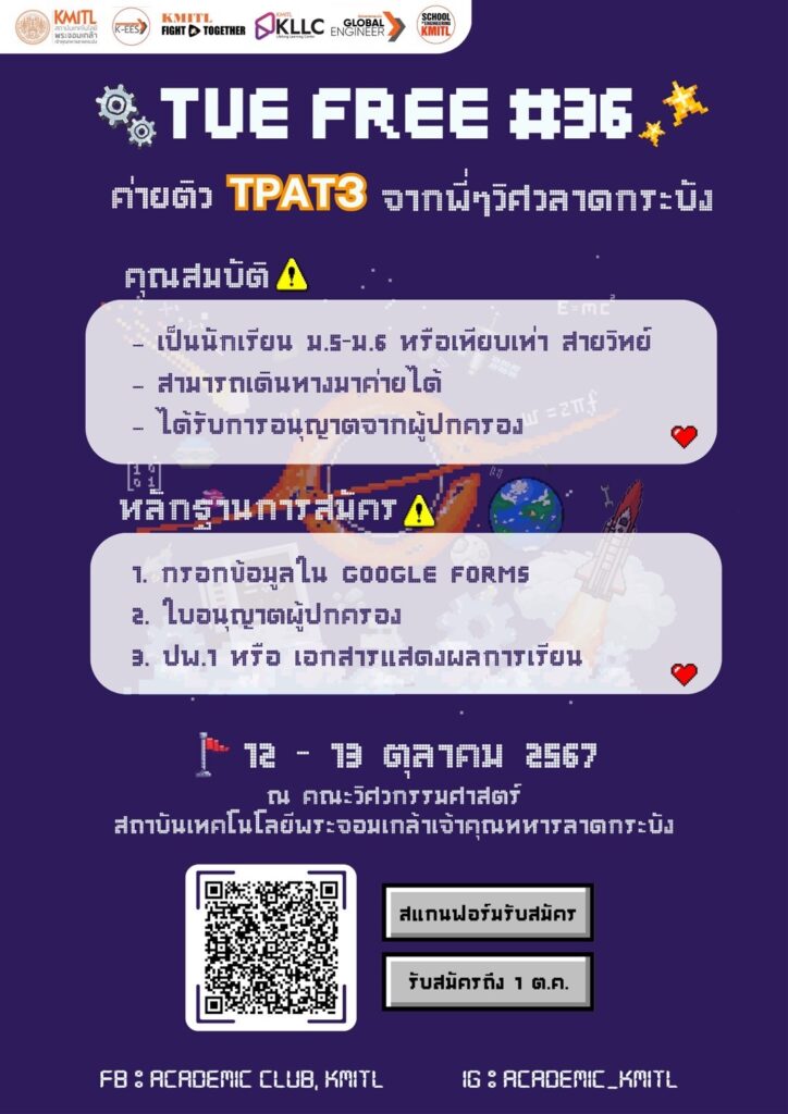 สถาบันเทคโนโลยีพระจอมกล้า เจ้าคุณทหารลาดกระบัง เพื่อใช้ในการสอบเข้ามหาวิทยาลัย และภายในค่ายยังมีกิจกรรมสนุกๆอีกมากมาย หลังจบค่ายนี้พี่ๆ รับประกันว่าน้องๆจะได้ความรู้ ความสนุก และเพื่อนใหม่ๆจากค่ายแน่นอน