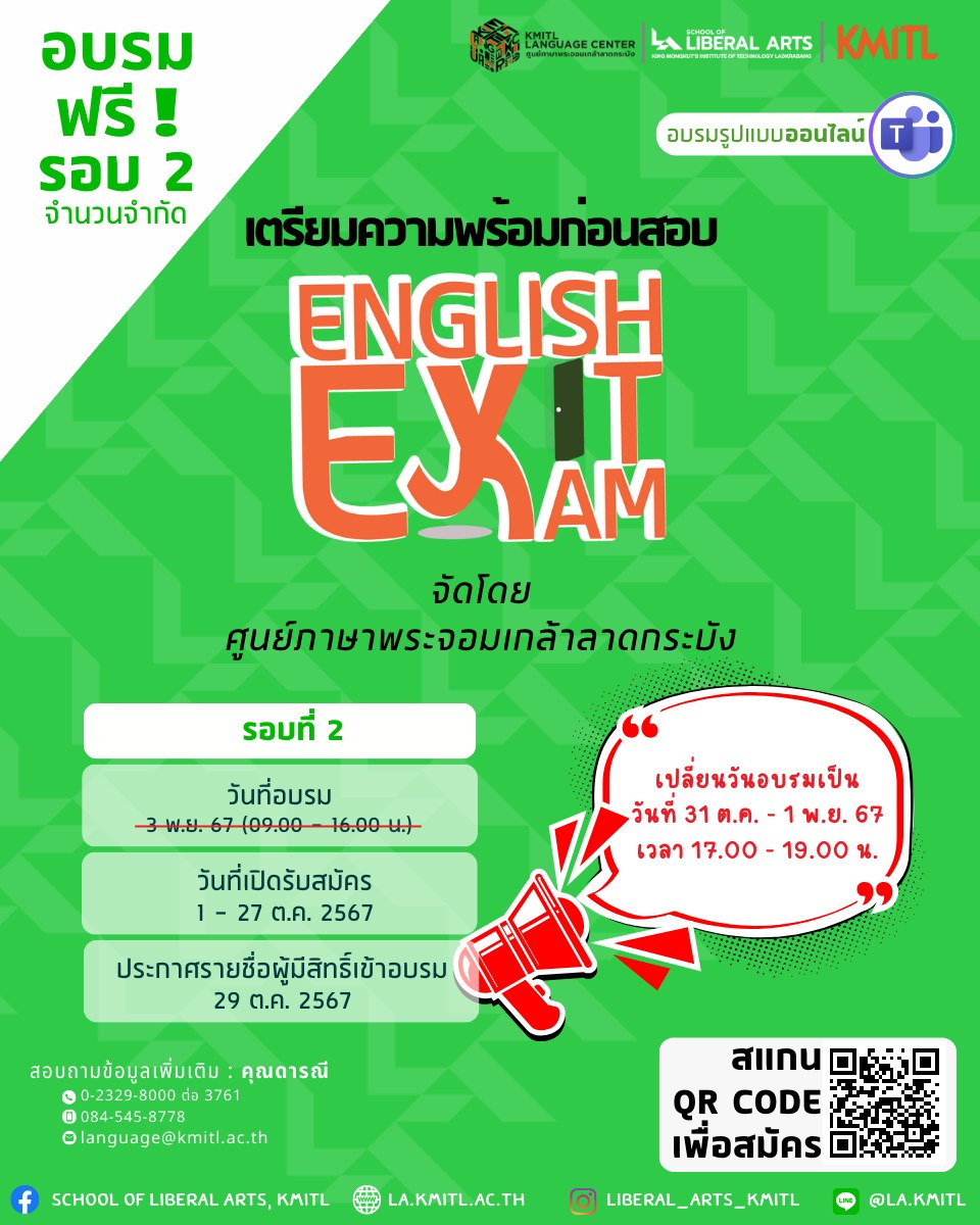 ฟรี! เตรียมความพร้อมก่อนสอบ ᴇɴɢʟɪꜱʜ ᴇxɪᴛ ᴇxᴀᴍ รอบ 2 สำหรับนักศึกษาระดับปริญญาตรี ชั้นปีสุดท้าย 100 คนต่อรอบเท่านั้น!