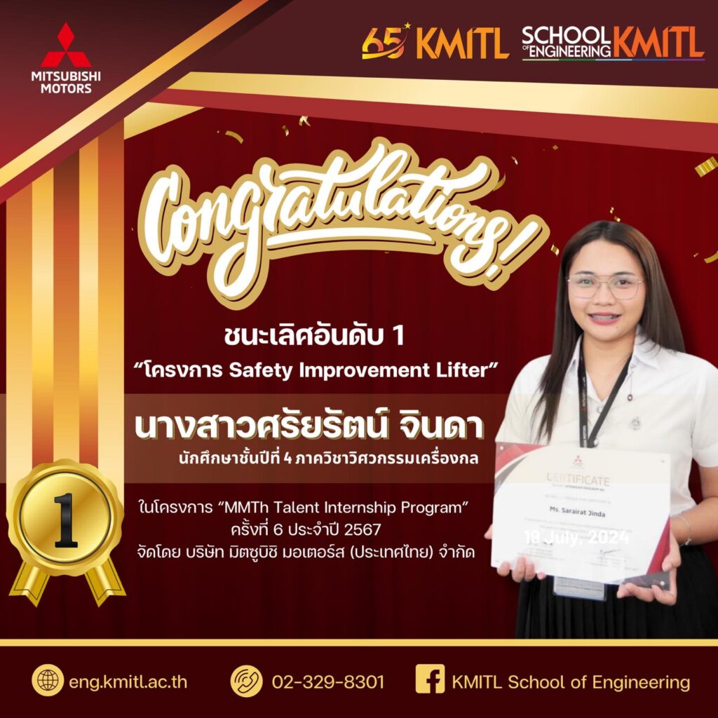 ขอแสดงความยินดีกับ นางสาวศรัยรัตน์ จินดา นักศึกษาชั้นปีที่4 ภาควิชาวิศวกรรมเครื่องกล ในโอกาสได้รับรางวัลชนะเลิศอันดับ 1 การประกวดโครงการฝึกงานยอดเยี่ยม (Top 5 Internship Project Award) จากโครงการ ‘MMTh Talent Internship Program’ ครั้งที่ 6 ประจำปี 2567 จากบริษัท มิตซูบิชิ มอเตอร์ส (ประเทศไทย) จำกัด