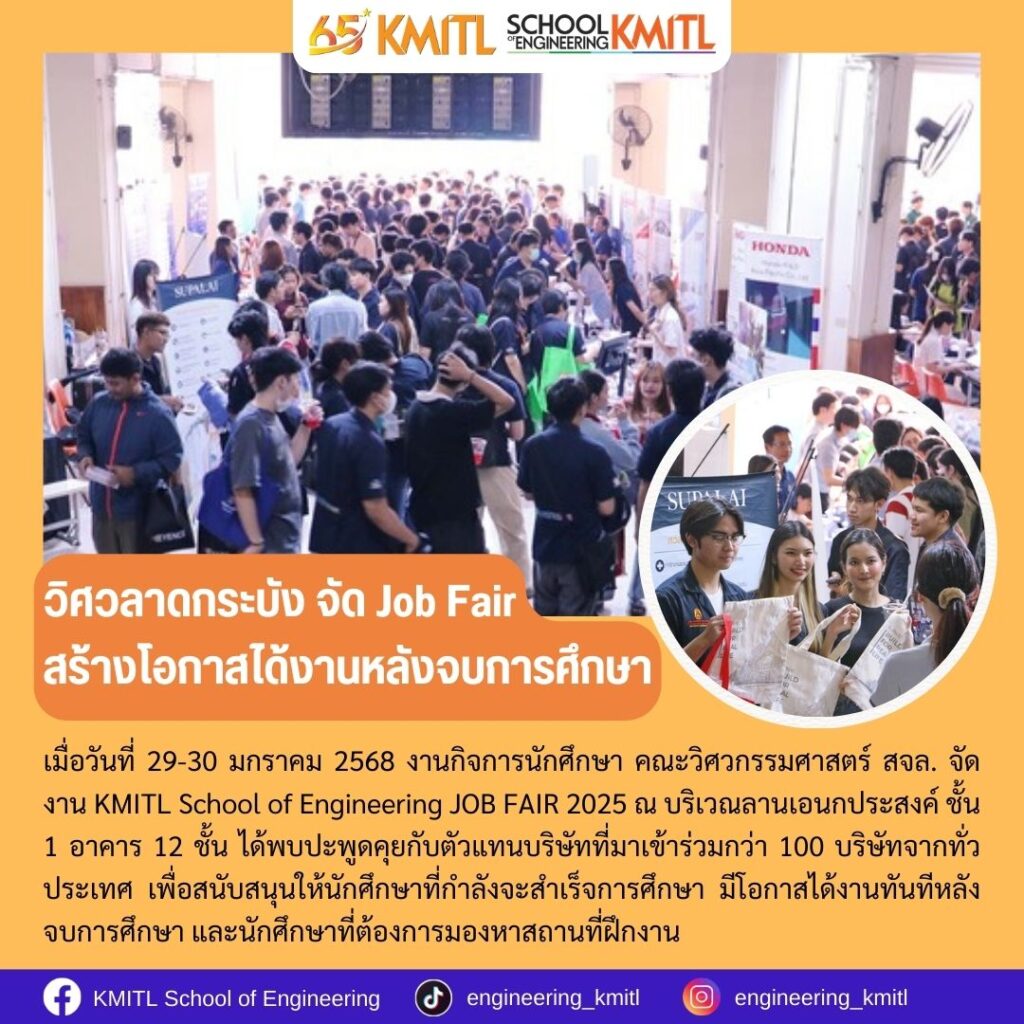 เมื่อวันที่ 29-30 มกราคม 2568 งานกิจการนักศึกษา คณะวิศวกรรมศาสตร์ สจล. จัดงาน KMITL School of Engineering JOB FAIR 2025 ณ บริเวณลานเอนกประสงค์ ชั้น 1 อาคาร 12 ชั้น ได้พบปะพูดคุยกับตัวแทนบริษัทที่มาเข้าร่วมกว่า 100 บริษัทจากทั่วประเทศ เพื่อสนับสนุนให้นักศึกษาที่กำลังจะสำเร็จการศึกษา มีโอกาสได้งานทันทีหลังจบการศึกษา และนักศึกษาที่ต้องการมองหาสถานที่ฝึกงาน