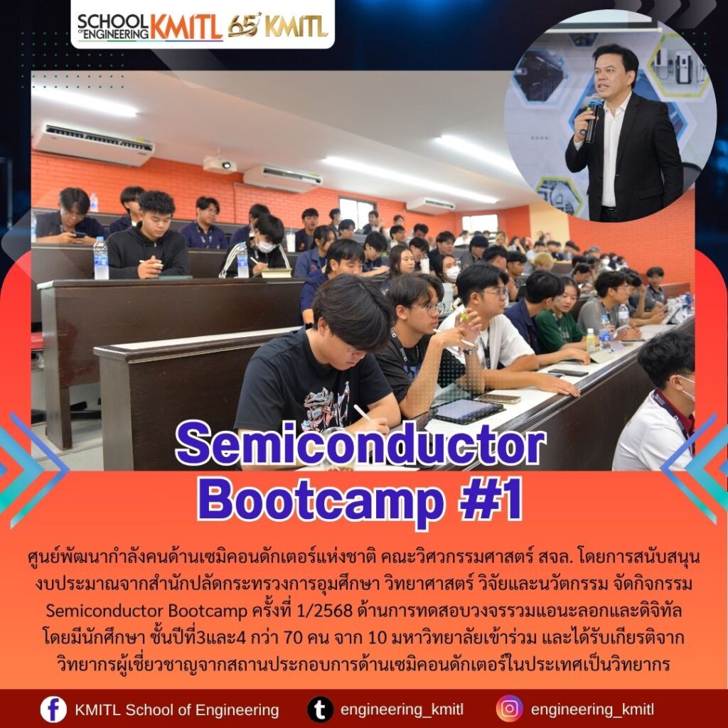 #วิศวลาดกระบัง . ศูนย์พัฒนากําลังคนด้านเซมิคอนดักเตอร์แห่งชาติ คณะวิศวกรรมศาสตร์ สจล. โดยการสนับสนุนงบประมาณจากสำนักปลัดกระทรวงการอุมศึกษา วิทยาศาสตร์ วิจัยและนวัตกรรม จัดกิจกรรม Semiconductor Bootcamp ครั้งที่ 1/2568 ระหว่างวันที่ 24-27 มิ.ย. 2568 Semiconductor Bootcamp มีการอบรมด้านการทดสอบวงจรรวมแอนะลอกและดิจิทัล โดยมีน้องนักศึกษา ชั้นปีที่ 3 และ 4 กว่า 70 คน จาก 10 มหาวิทยาลัยเข้าร่วมการอบรม และได้รับเกียรติจากวิทยากรผู้เชี่ยวชาญด้านเซมิคอนดักเตอร์ จากสถานประกอบการในประเทศ จัดเต็มทั้งภาคทฤษฎี และลงมือปฏิบัติจริงด้าน IC Testing พร้อมทั้งเยี่ยมชมไลน์การผลิตในสถานประกอบการ !!ผู้สนใจโปรดติดตามการเปิดรับสมัครการจัดกิจกรรมในครั้งต่อไป