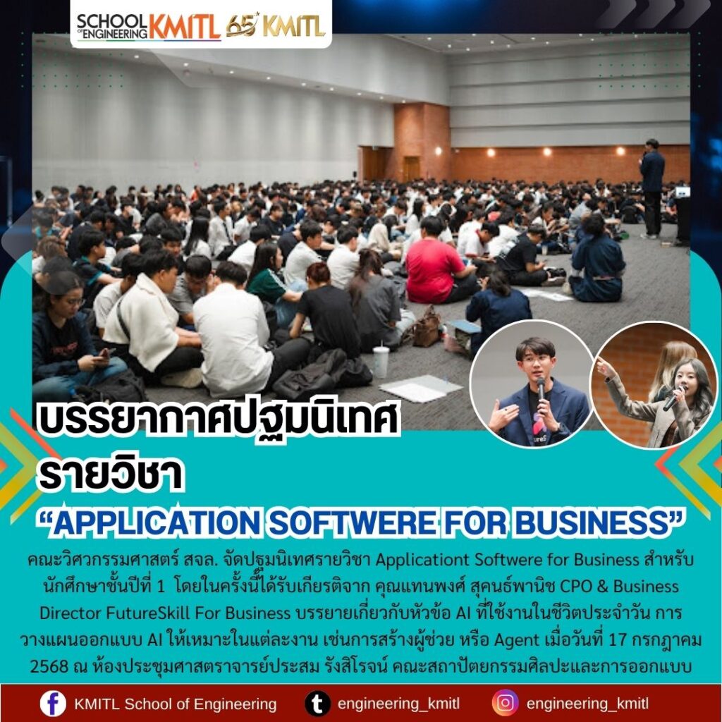 คณะวิศวกรรมศาสตร์ สจล. จัดปฐมนิเทศรายวิชา Application Softwere for Business สำหรับนักศึกษา ชั้นปีที่ 1 โดยในครั้งนี้ได้รับเกียรติจาก คุณแทนพงษ์  สุคนธ์พานิช CPO & Business Dicrctor FutureSkill For Businesss บรรยายเกี่ยวกับหัวข้อ AI ที่ใช้งานในชีวิตประจำวัน การวางแผนออกแบบ AI ให้เหมาะในแต่ละงาน ณ ห้องประชุมศาสตราจารย์ประสม รังสิโรจน์ คณะสถาปัตยกรรมศิลปะและการออกแบบ
